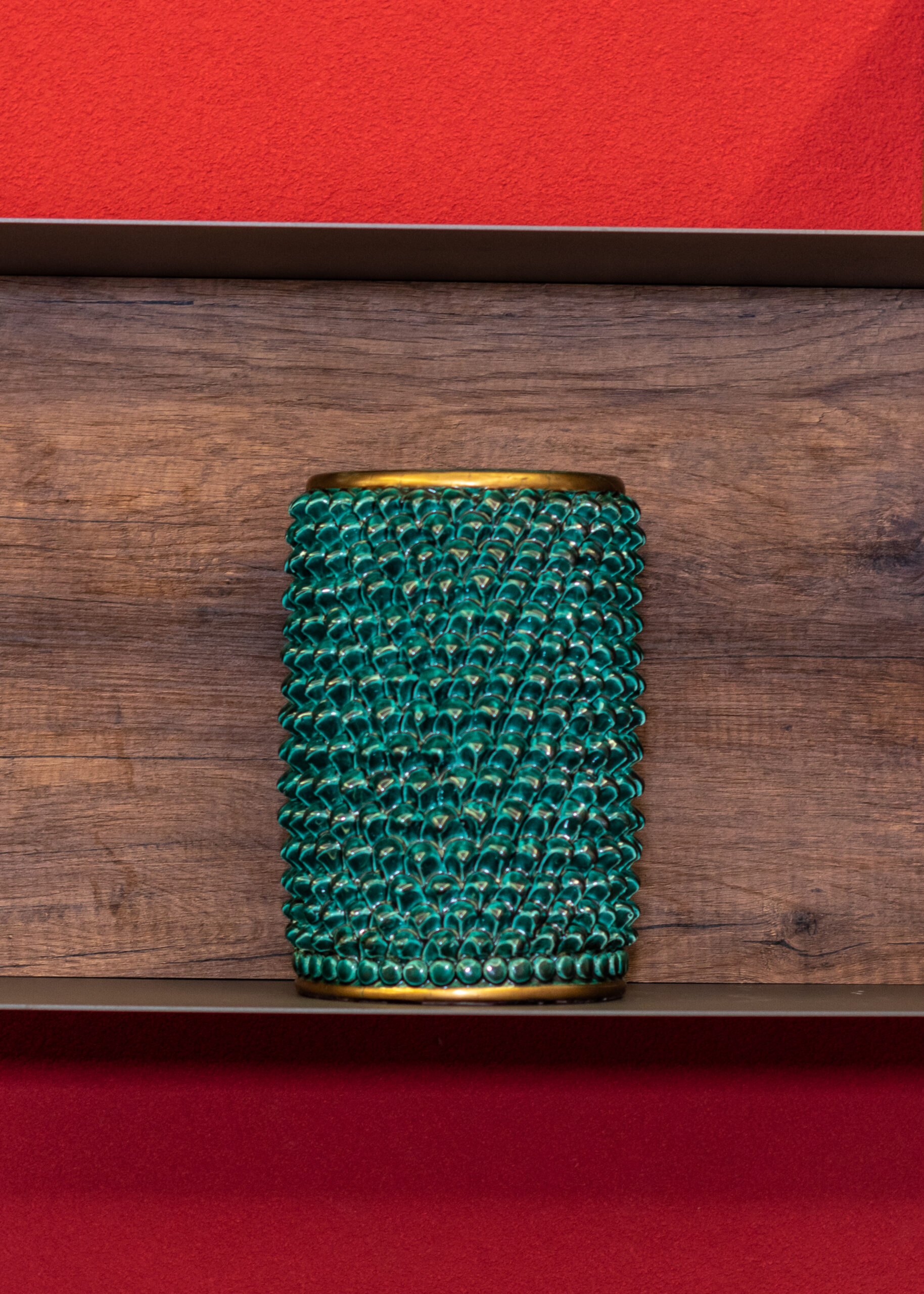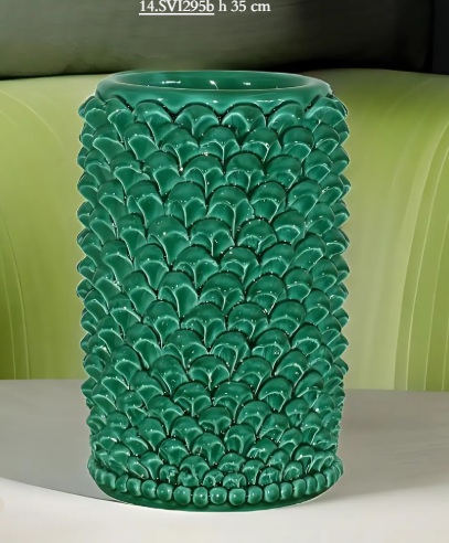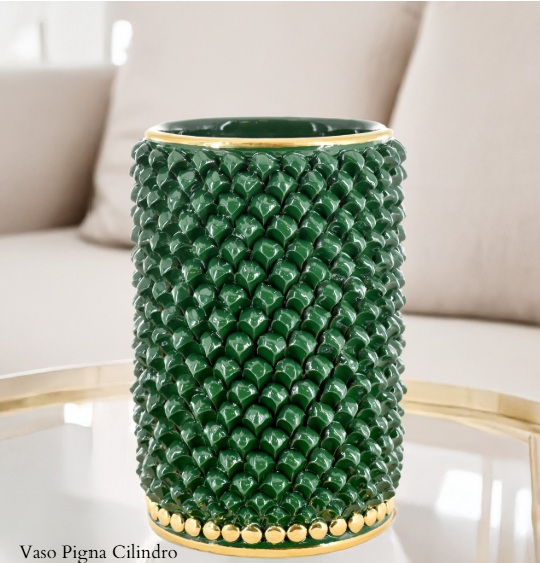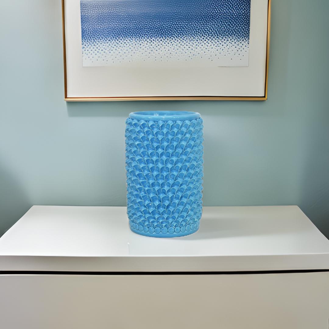 Vase handcrafted according to the traditional Sicilian ceramic art. The surface is entirely covered with small pinecone-shaped scales, creating a rich, three-dimensional texture inspired by the style of Caltagirone.